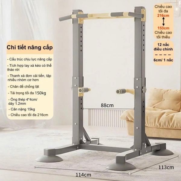 Sản phẩm sử dụng thép hộp 4x4cm dày 1.2mm, tải trọng tối đa 200g, cùng 12 nấc điều chỉnh chiều cao từ 153cm đến 216cm, đáp ứng tốt cho nhiều đối tượng và nhiều bài tập khác nhau.