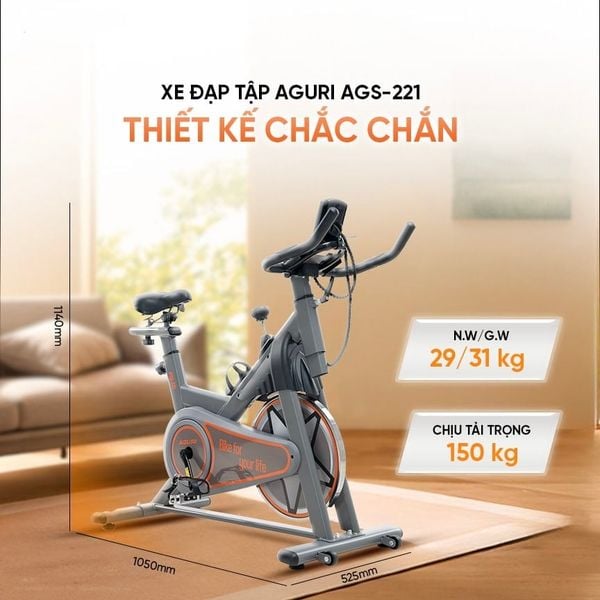 Aguri AGS-221 là spin bike gia đình tải tối đa 150kg, bánh đà 5kg – truyền động dây curoa êm ái, phanh ma sát có dừng khẩn cấp, ghi đông & yên chỉnh cao–thấp/xa–gần. Màn hình LCD hiển thị quãng đường, vận tốc, thời gian, calories, nhịp tim; có giá để điện thoại/iPad, giá chai nước, bánh xe di chuyển.