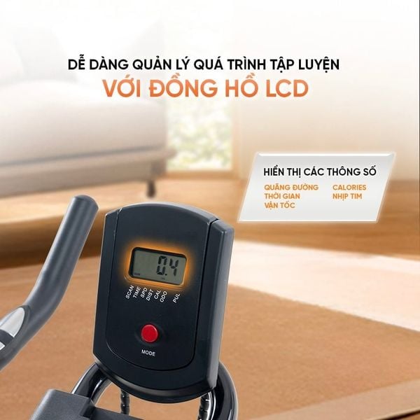 LCD đủ thông số: distance, speed, time, calories, pulse.